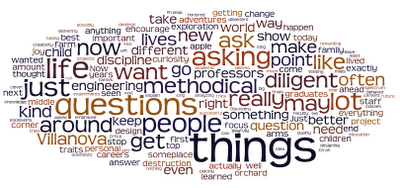 The graduation speaker at Villanova University last week was Mythbuster Jamie Hyneman. His speech is now posted on the Discovery Channel web site. It made a nice word-cloud.