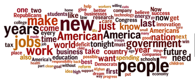 NPR is playing with some of my favorite on-line tools this evening following President Obama's fine and inspiring State of the Union speech. They've asked folks, via twitter, to respond to a very brief survey asking for three words in reaction to the speech. and they are running the results through the wordle word-cloud creator.