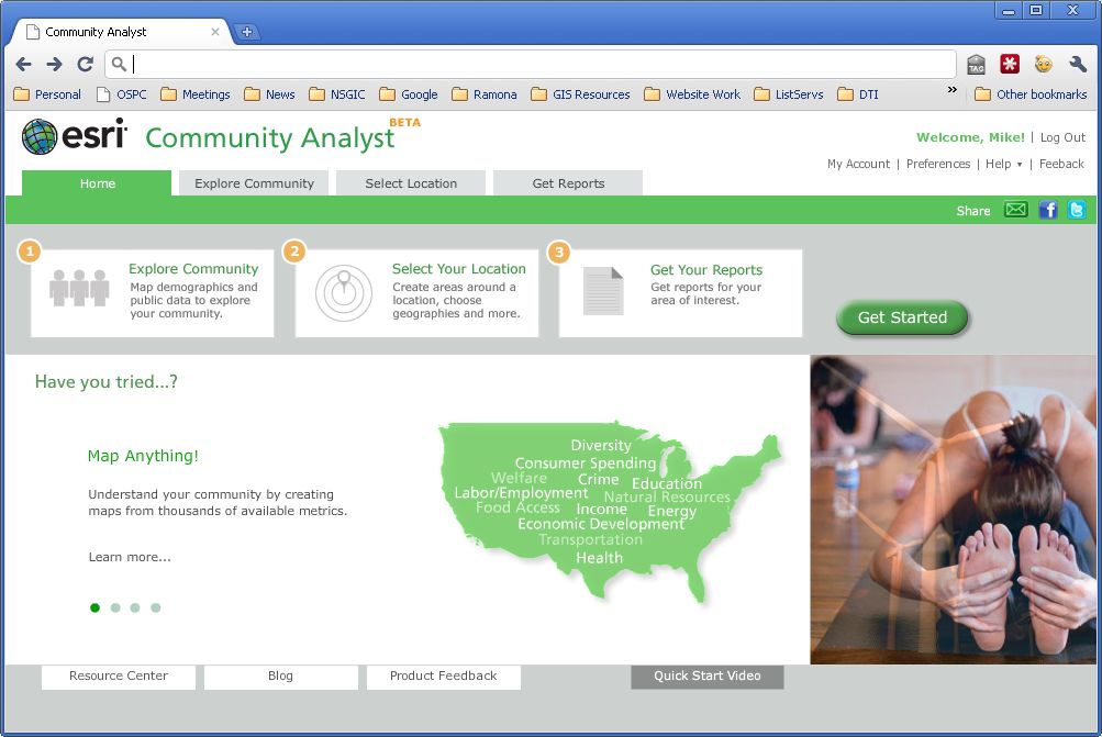 I spent a bit of time today at work checking out a new on-line data exploration and mapping site from the GIS company ESRI. Community Analyst was announced as part of a federal government GIs conference (I was watching via twitter). It is a promising tool and may be a real success.